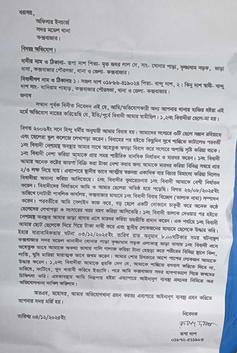এছাড়া তিনি আরো দাবি করেন, তার স্বামী ও সংশ্লিষ্ট নারীরা মিলিতভাবে তাকে বাড়ি থেকে বের করে দেওয়ার চেষ্টা করে এবং তার স্বর্ণালংকারসহ মূল্যবান সম্পদ হাতিয়ে নেয়। সর্বশেষ ১ ডিসেম্বর স্বামী বাড়িতে এসে তাকে প্রাণনাশের হুমকি প্রদান ও নাবালিকা মেয়ের সঙ্গে অশোভন আচরণ করে বলেও অভিযোগ করেন তিনি। নিজের ও সন্তানদের জীবনের নিরাপত্তা চেয়ে রূপা দাস কক্সবাজার সদর মডেল থানায় লিখিত অভিযোগ দায়ের করেছেন। তিনি দ্রুত আইনানুগ ব্যবস্থা গ্রহণ ও তাদের নিরাপত্তা নিশ্চিত করার জন্য প্রশাসনের আন্তরিক হস্তক্ষেপ কামনা করেছেন।